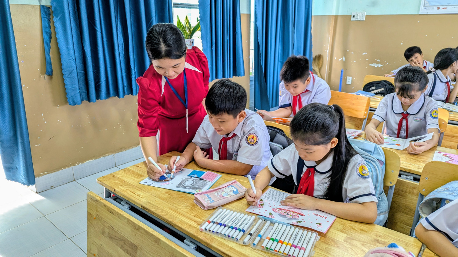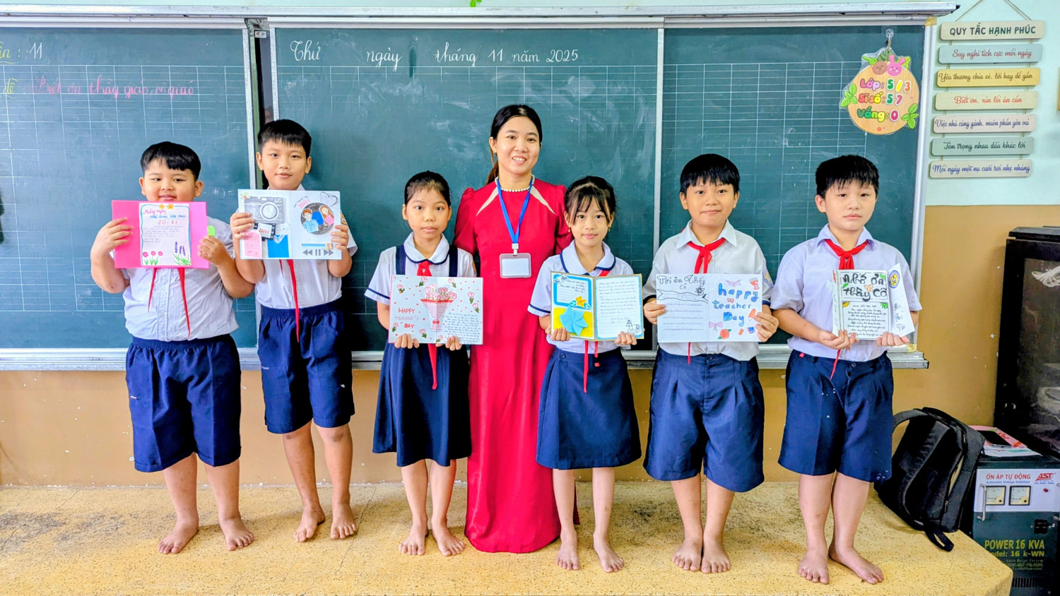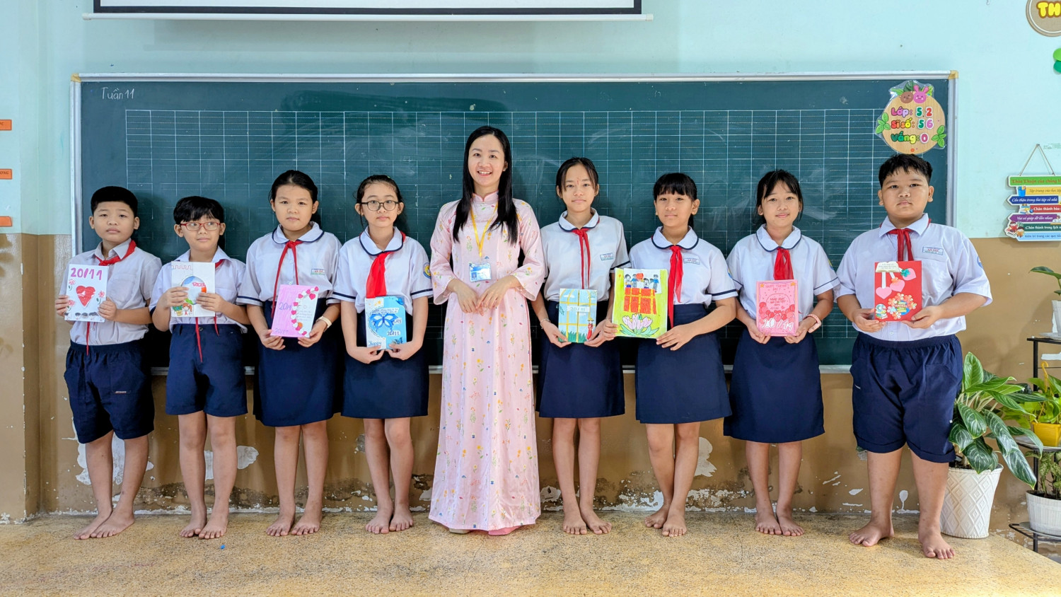 Ngay từ đầu tháng 11, giáo viên chủ nhiệm đã triển khai kế hoạch, gợi ý một số kiểu thiệp phù hợp với lứa tuổi tiểu học như thiệp gấp, thiệp vẽ tay, thiệp 3D, thiệp cắt dán giấy màu. Trong buổi thực hành tại lớp, các em học sinh lớp 5 tham gia với tinh thần hào hứng và đầy trách nhiệm, chăm chút từng nét vẽ, khéo léo cắt dán hoa văn, phối màu để chiếc thiệp trở nên sinh động và đẹp mắt. Nhiều sản phẩm còn chứa đựng những câu chúc ngây thơ, hồn nhiên nhưng rất cảm động, thể hiện tình cảm chân thành của học sinh đối với người đã tận tâm dạy dỗ các em.