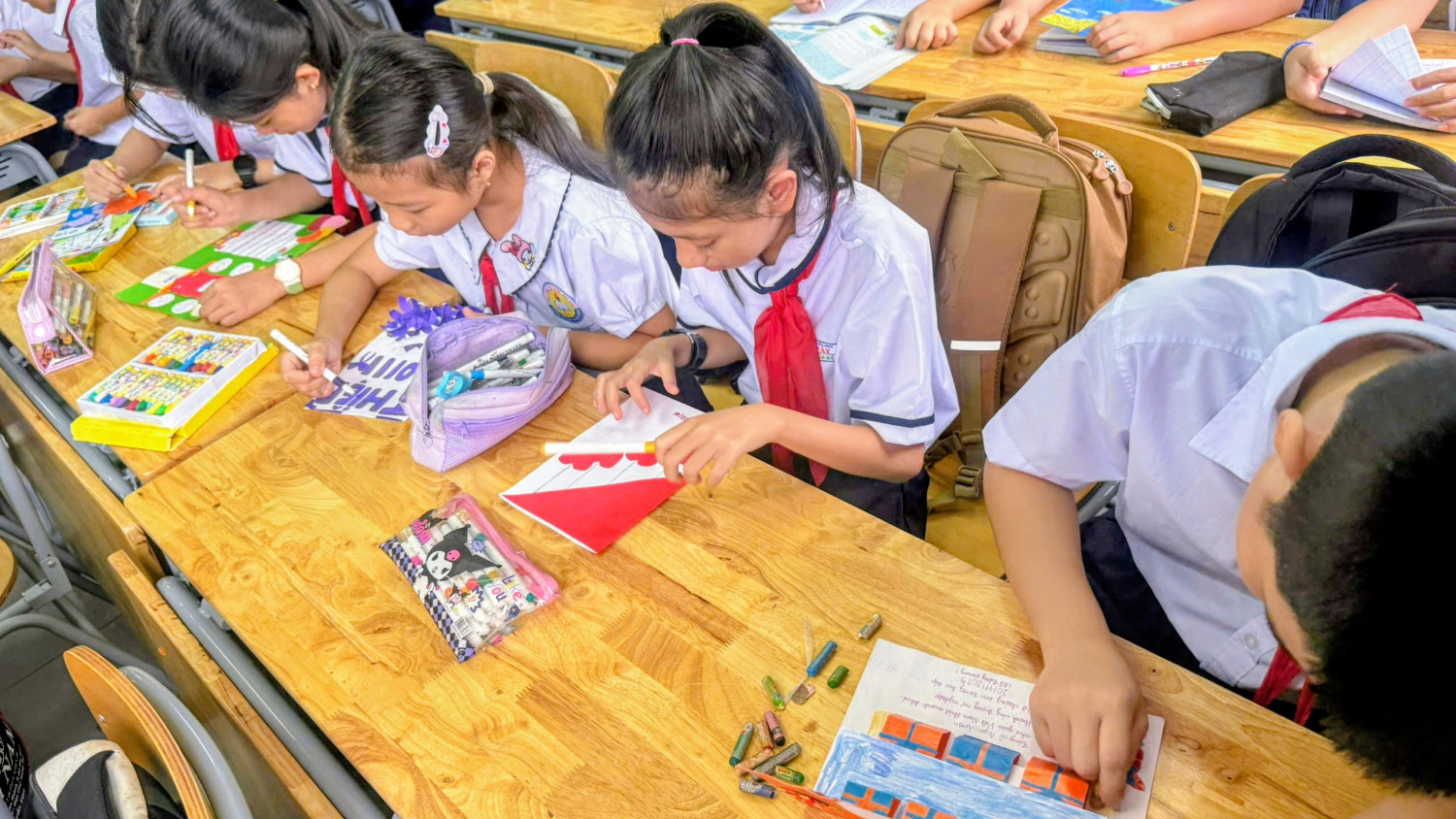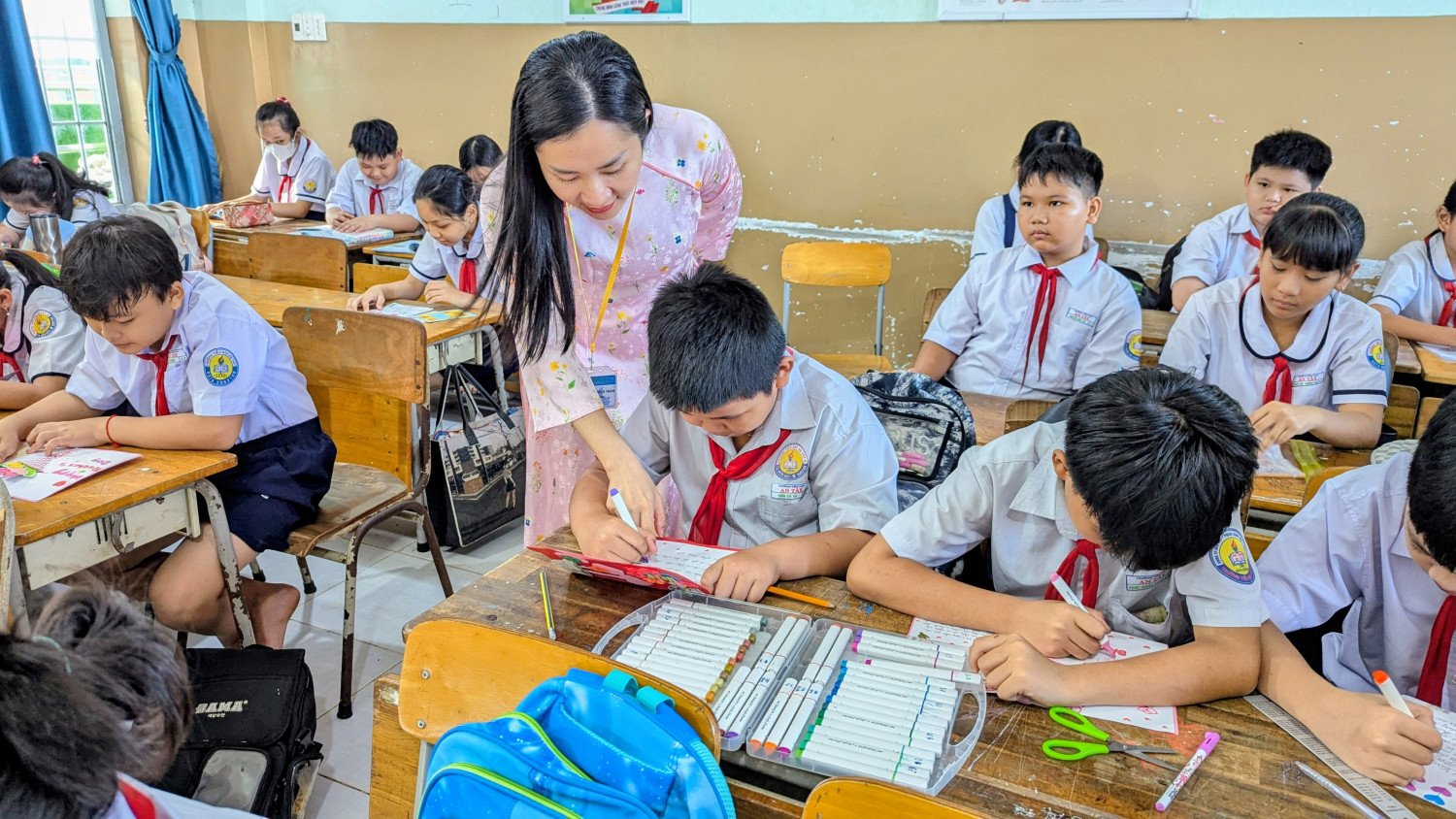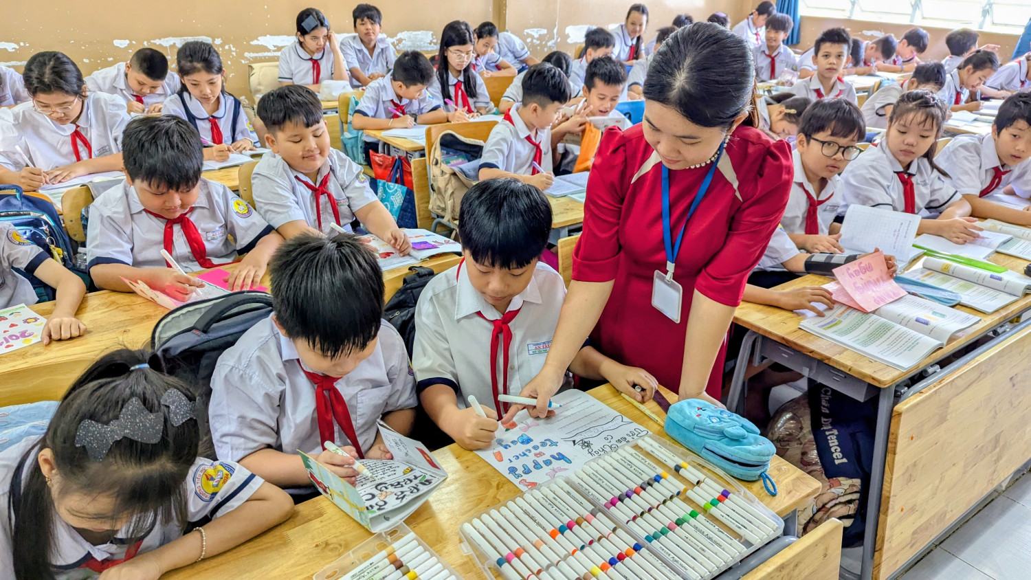 Ngay từ đầu tháng 11, giáo viên chủ nhiệm đã triển khai kế hoạch, gợi ý một số kiểu thiệp phù hợp với lứa tuổi tiểu học như thiệp gấp, thiệp vẽ tay, thiệp 3D, thiệp cắt dán giấy màu. Trong buổi thực hành tại lớp, các em học sinh lớp 5 tham gia với tinh thần hào hứng và đầy trách nhiệm, chăm chút từng nét vẽ, khéo léo cắt dán hoa văn, phối màu để chiếc thiệp trở nên sinh động và đẹp mắt. Nhiều sản phẩm còn chứa đựng những câu chúc ngây thơ, hồn nhiên nhưng rất cảm động, thể hiện tình cảm chân thành của học sinh đối với người đã tận tâm dạy dỗ các em.