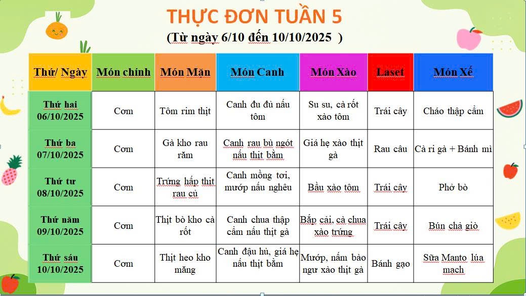 Thực đơn Tuần 5 từ ngày 06/10/2025 đến 10/10/2025